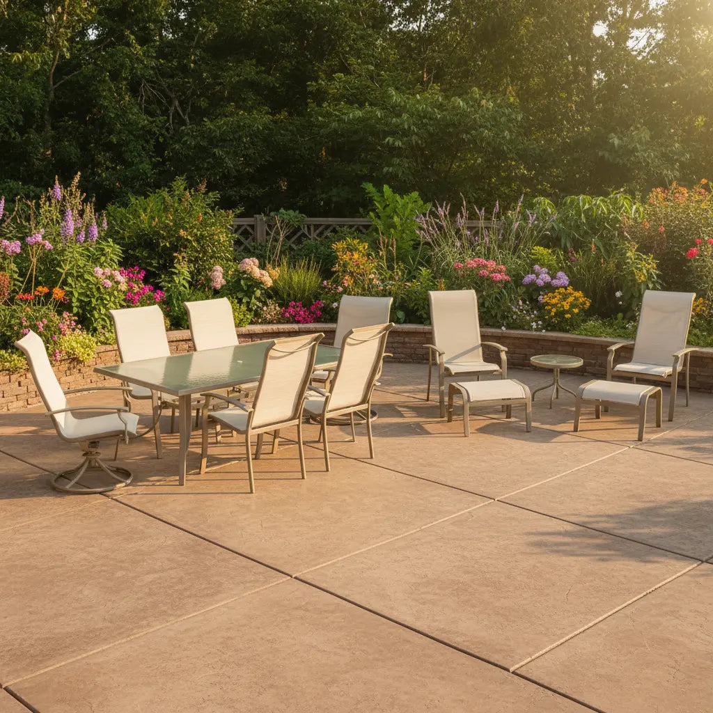 Elevate your outdoor dining experience with the Solana 12 Piece Dining Chat Group. The taupe frame and light beige sling offer durability and style, while the two high back sling swivel rockers and four stacking dining chairs provide comfort and support. The 42" x 84" rectangle dining table completes the set, making it perfect for entertaining. This set also includes one 20" round end table with glass, two high back adjustable sling lounge chairs, and two sling ottomans. Versatile and stylish for any outdoor space.