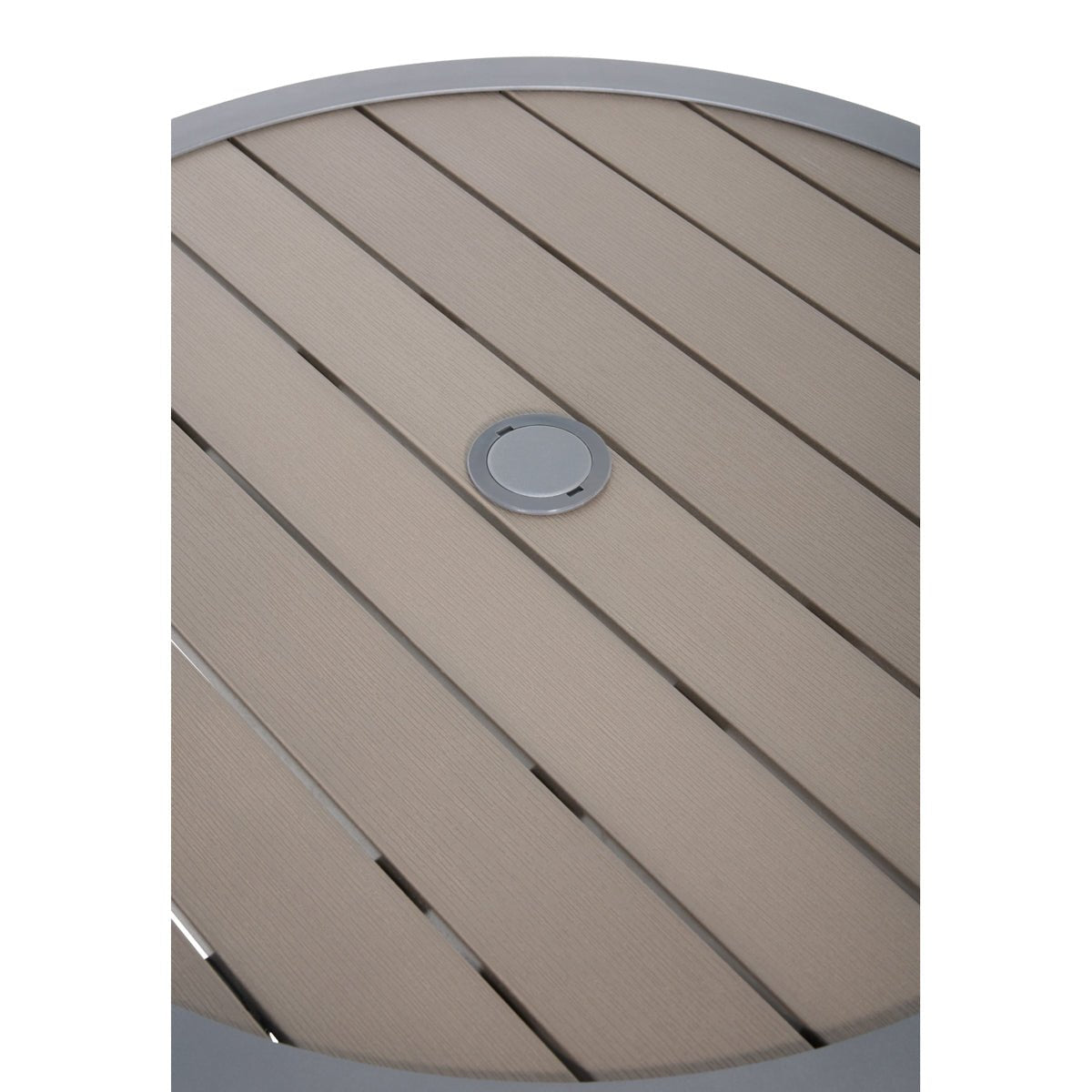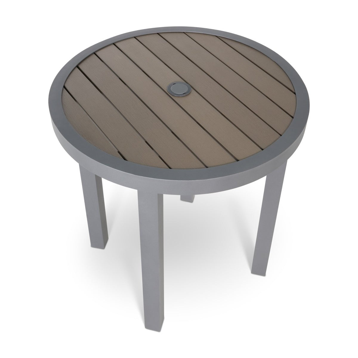 The St. Kitts Sling 3 Piece Bistro Group offers durable and stylish outdoor seating for any occasion. The graphite frame and Tiffany Silver sling provide both comfort and elegance. The 28" Round Mesa Graphite and Poly Taupe Top Dining Table pairs perfectly with the two Grey Graphite Sling Stacking Dining Chairs. Perfect for all outdoor spaces.