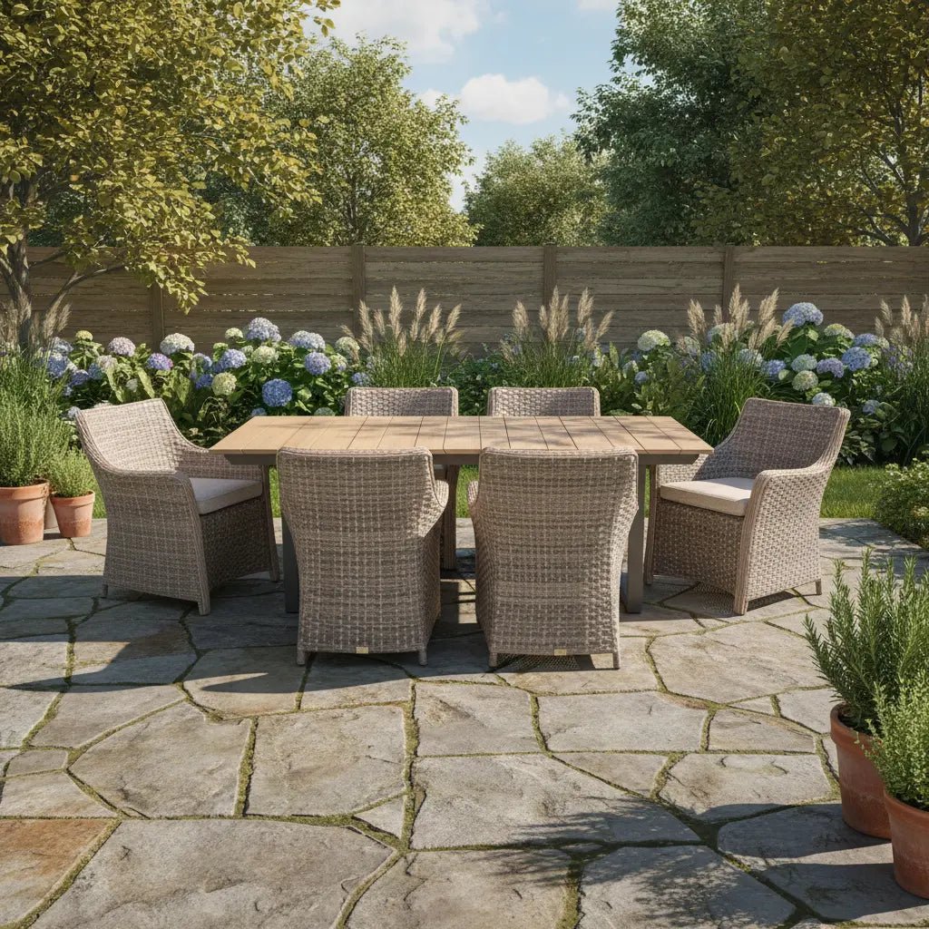Expertly crafted, the Tacoma 7 Piece Woven Dining Group is the perfect addition to any patio collection. This group offers both style and durability, with deluxe cushions, resin/vinyl wicker, and welded frames. The 48" x 80" Rectangle E-Teak Slat Dining Table expertly coordinates with the 6 Cushioned Woven Dining Arm Chairs, making your dining experience both one of ease, and one of style. The Grey Blend weave and Oat colored fabric bring refreshing lightness to any outdoor space. Improve your outdoor dining experience today with the Tacoma 7 Piece Woven Dining Group.